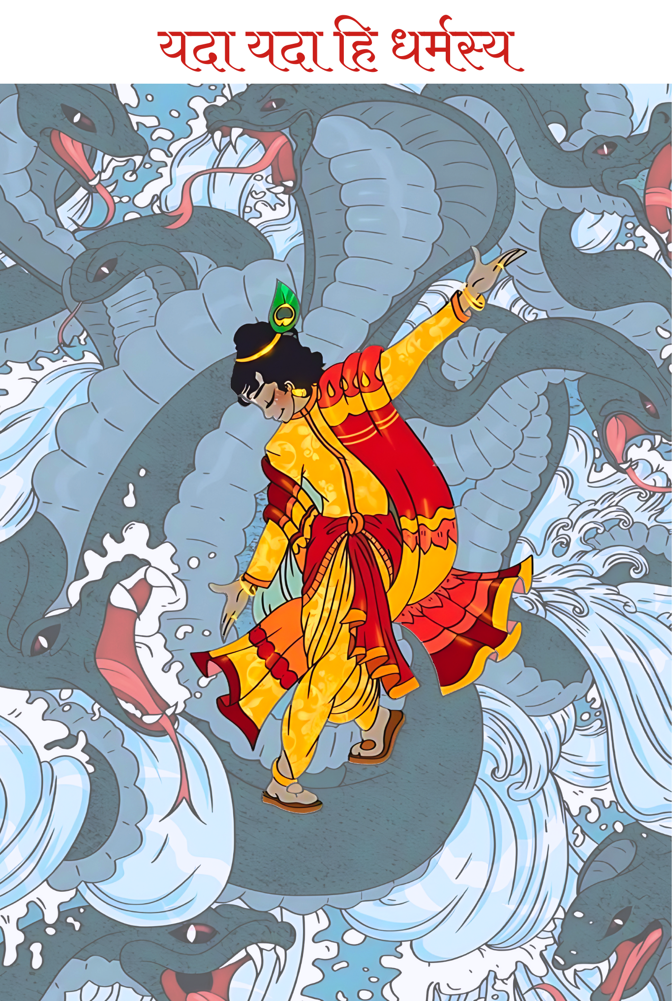 Vibrant illustration of Krishna's Kaliya Naag Leela